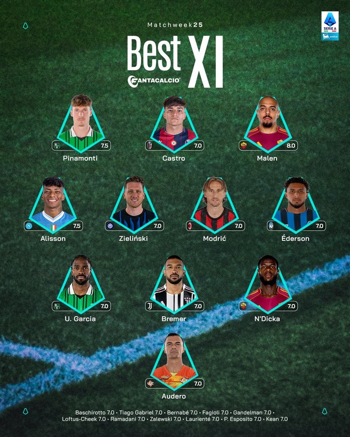 意甲第25轮最佳阵容:莫德里奇、泽林斯基、布雷默、马伦在列